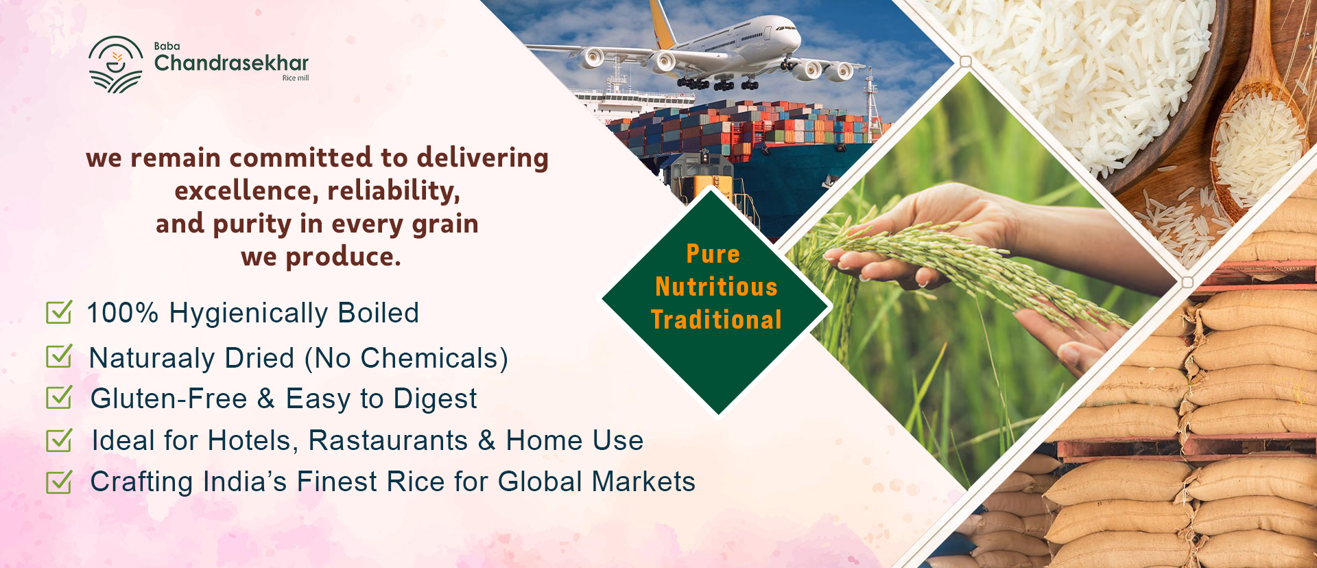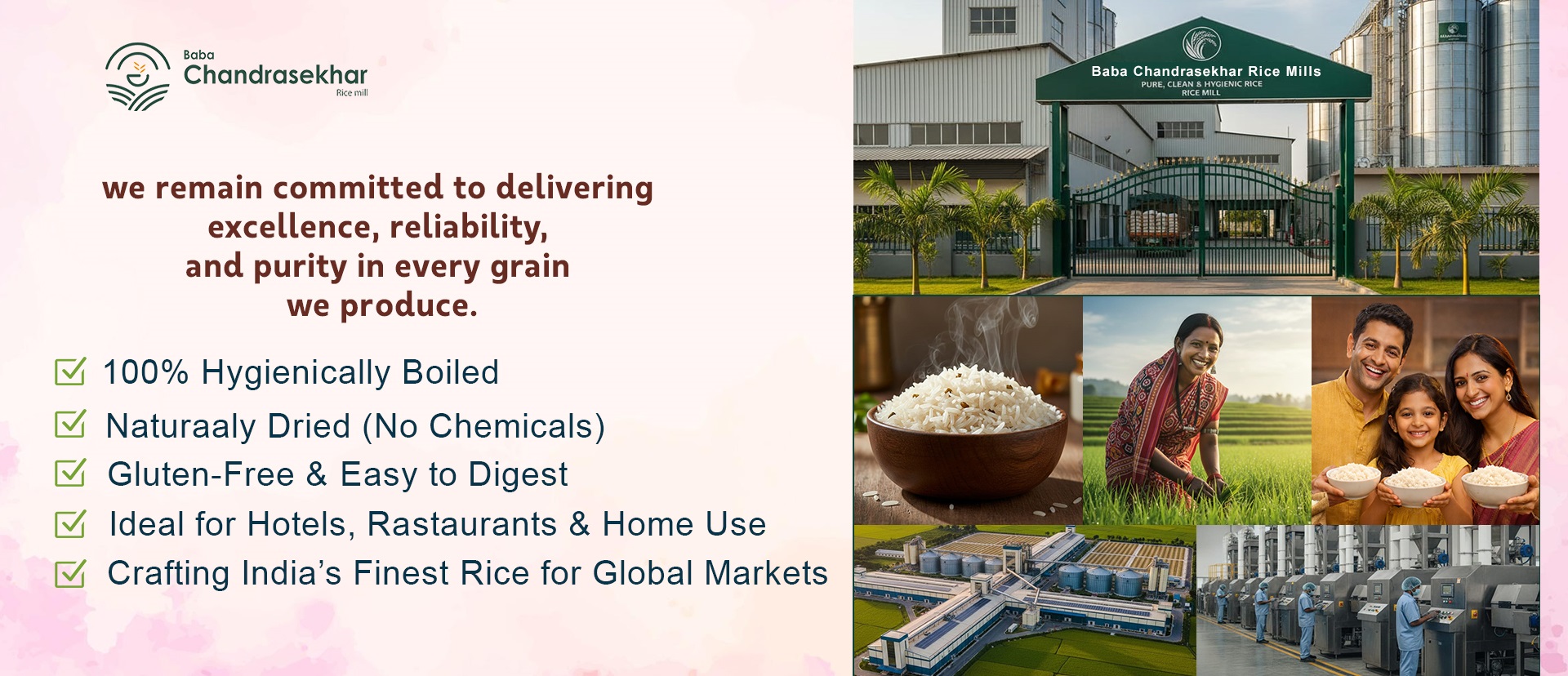 Baba Chandrasekhar Rice Mills Pvt. Ltd. is a distinguished name in India’s rice milling industry, built on a foundation of trust, integrity, and uncompromising quality. Through consistent performance and unwavering standards, we have earned the confidence of partners and customers across the country as a reliable rice manufacturer, miller, and supplier, delivering excellence in every grain.